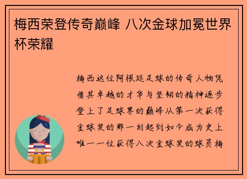 梅西荣登传奇巅峰 八次金球加冕世界杯荣耀